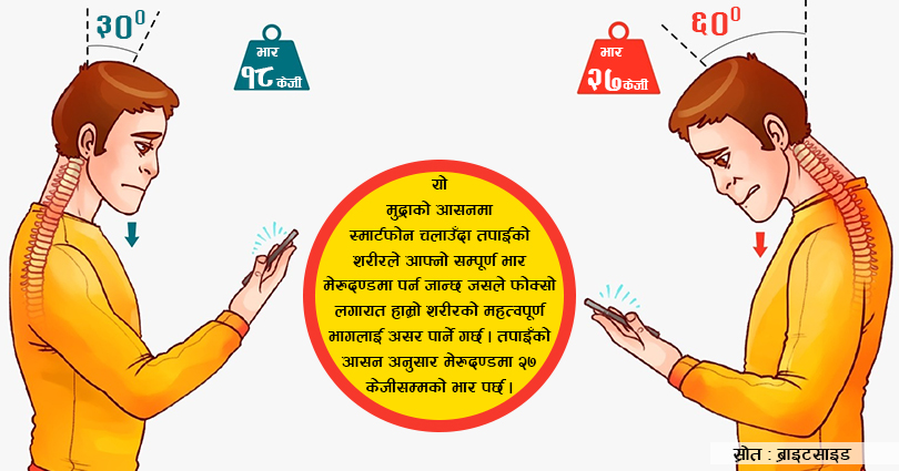 यो मुद्राको आसनमा स्मार्टफोन चलाउँदा तपाईको शरीरले आˆनो सम्पूर्ण भार मेरुदण्डमा पर्न जान्छ जसले फोक्सो लगायत हाम्रो शरीरको महत्वपूर्ण भागलाई असर पार्ने गर्छ । तपाइँको आसनअनुसार मेरुदण्डमा २७ केजीसम्मको भार पर्न जान्छ ।