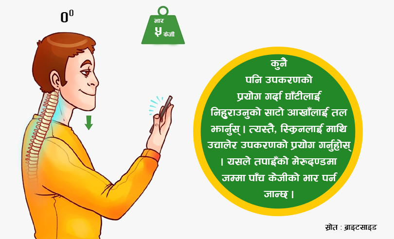 कुनै पनि उपकरणको प्रयोग गर्दा घाँटीलाई निहुराउनुको साटो आखाँलाई तल झार्नुस् । त्यस्तै, स्कि्रनलाई माथि उचालेर उपकरणको प्रयोग गर्नुहोस् । यसले तपाइँको मेरुदण्डमा जम्मा पाँच केजीको भार पर्न जान्छ ।